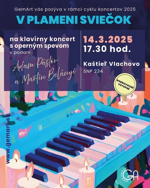 V rámci celoročného projektu „Koncerty v plameni sviečok na Gemeri 2025“, ktorý obsahuje: \n\nKomorný koniec zimy v zabudnutých kaštieľoch – marec / apríl \nMelodickú jar v parkoch a záhradách – apríl / máj\nRock – popovú jeseň pri technických pamiatkach – september / október\nSviatočný advent v Božích chrámoch - december\n\nsi vás dovoľujeme pozvať na klavírny koncert s operným spevom dvoch mladých gemerských umelcov, Adama Pástora a Martina Belányiho \ndňa 14.3.2024 o 17:30 hod. v kaštieli vo Vlachove. \n\nVstupné je dobrovoľné. \n\nTešíme sa na vás všetkých. \n\n\nhttps://www.facebook.com/events/909860901318383/