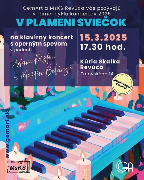 V rámci celoročného projektu „Koncerty v plameni sviečok na Gemeri 2025“, ktorý obsahuje:\nKomorný koniec zimy v zabudnutých kaštieľoch – marec / apríl\nMelodickú jar v parkoch a záhradách – apríl / máj\nRock – popovú jeseň pri technických pamiatkach – september / október\nSviatočný advent v Božích chrámoch - december\n\nsi vás dovoľujeme pozvať na klavírny koncert s operným spevom dvoch mladých gemerských umelcov, Adama Pástora a Martina Belányiho\ndňa 15.3.2024 o 17:30 hod. v kúrii Skalka v Revúcej.\nVstupné je dobrovoľné.\nTešíme sa na vás všetkých.\n\nhttps://www.facebook.com/events/1278628033446039/