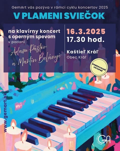 V rámci celoročného projektu „Koncerty v plameni sviečok na Gemeri 2025“, ktorý obsahuje: \n\nKomorný koniec zimy v zabudnutých kaštieľoch – marec / apríl \nMelodickú jar v parkoch a záhradách – apríl / máj\nRock – popovú jeseň pri technických pamiatkach – september / október\nSviatočný advent v Božích chrámoch - december\n\nsi vás dovoľujeme pozvať na klavírny koncert s operným spevom dvoch mladých gemerských umelcov, Adama Pástora a Martina Belányiho \ndňa 16.3.2024 o 17:30 hod. v kaštieli v obci Kráľ. \n\nVstupné je dobrovoľné. \n\nTešíme sa na vás všetkých. \n\n\nhttps://www.facebook.com/events/959577402272048/