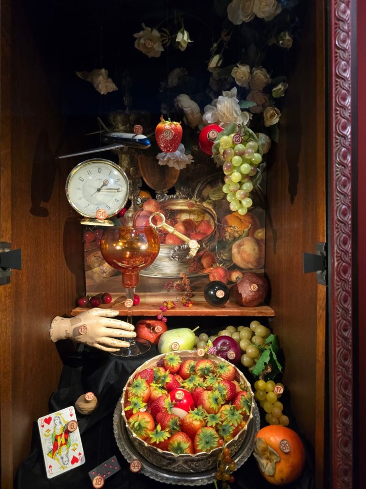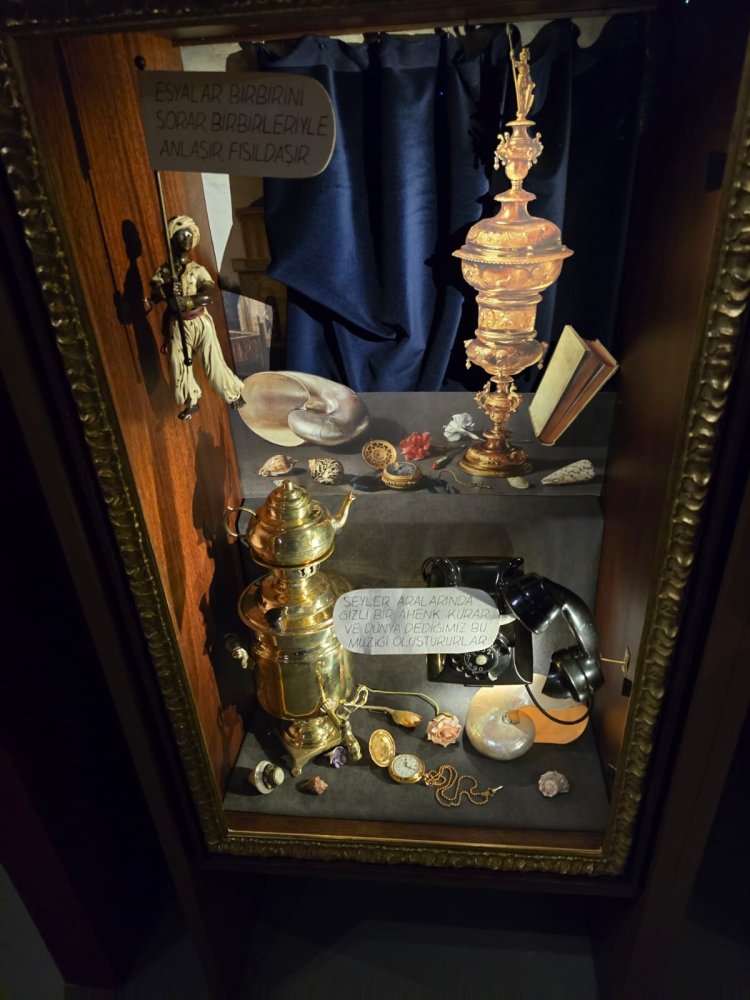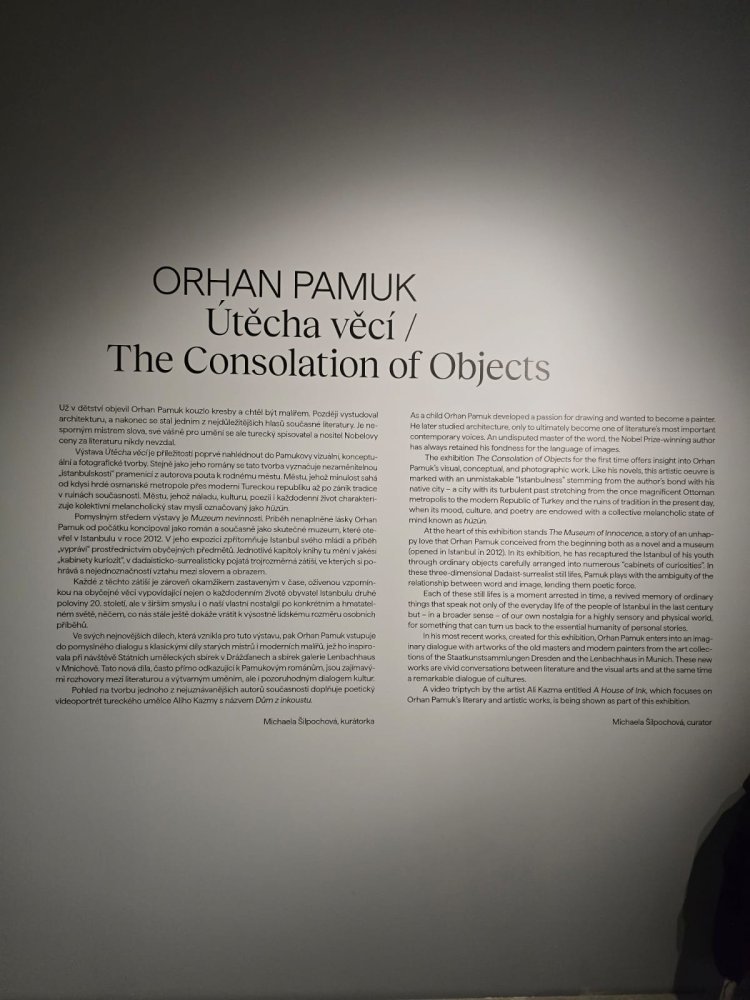 Výstava tureckého spisovateľa a nobelistu Orhana Pamuka: Útecha vecí je ukážkou toho, ako sám autor jednotlivé kapitoly jeho knihy premieňa na trojrozmerné zátišia – kabinety kuriozít, cez ktoré dadaisticko-surrealistickým spôsobom, neverbálne, rozpráva príbeh, ktorý predtým napísal.