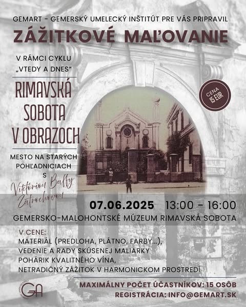 Pozývame Vás na cyklus Zážitkových maľovaní - Vtedy a dnes - Rimavská sobota v obrazoch na starých pohľadniciach s Viktóriou Baffy Zatrochovou. \nCena je 15 eur, všetko potrebné je v cene :-).\nRegistrácia nutná na e-mailu: info@gemart.sk \n\nhttps://www.facebook.com/events/1508143413211190/
