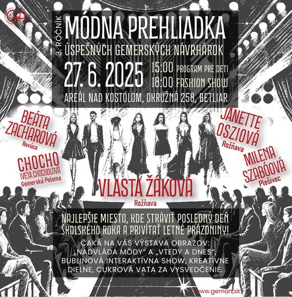Jedna z našich neplánovaných, o to však obľúbenejších aktivít na Gemeri je pre nás zorganizovať posledný deň školského roku Módnu prehliadku s kreatívnym programom pre deti. Tento rok budeme chystať už tretí ročník 😊. Módna prehliadka je u Gemerčanov veľmi obľúbená, minulý rok bola účasť viac ako 350 návštevníkov. \nTento rok uvidíte nové modely, nové módne návrhárky a návrhárov a opäť na vás bude čakať fantastický kreatívny program pre deti, bublinová show, výtvarná výstava, cukrová vata a popcorn. \nTešíme sa na vás všetkých. \n\n\nhttps://www.facebook.com/events/599878956117987/
