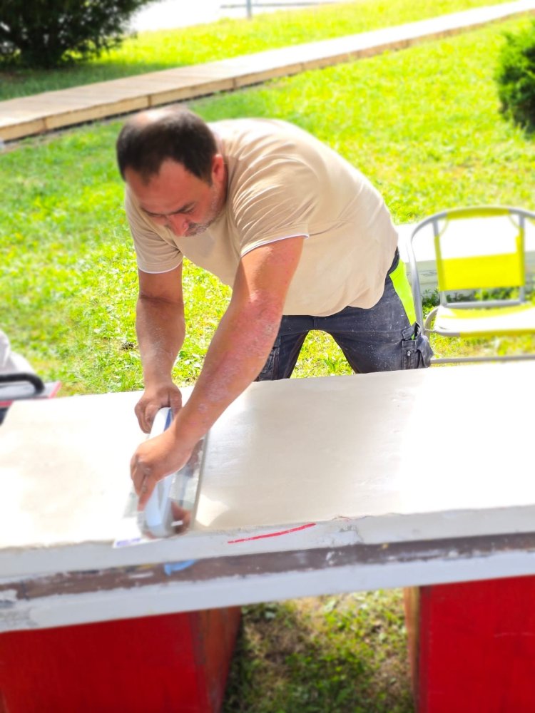 Po celú dobu workshopu sme mali k dispozícii murára (ďakujeme Robi), ktorý nám na pripravené panely s vápennocementovou omietkou nanášal priamo pred nami čerstvú, tenkú vrstvu jemnej vápnovej omietky tak, aby sme si mohli vyskúšať maľovanie do vlhkej omietky – al fresco. Nepoužívali sme hotové farby, ale pigmenty sme si miešali sami s vodou, aby sme získali farbu, ktorú sme nanášali na stenu. Ako postupne omietka schla, dokončovali sme maľbu na sucho – al secco. Pri tejto technike sme pigment miešali so spojivom – kostným glejom – ktorý sme pred tým uvarili.