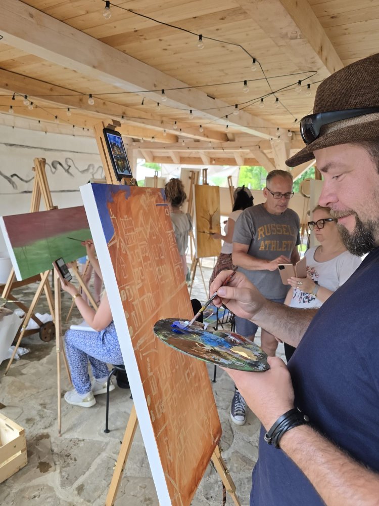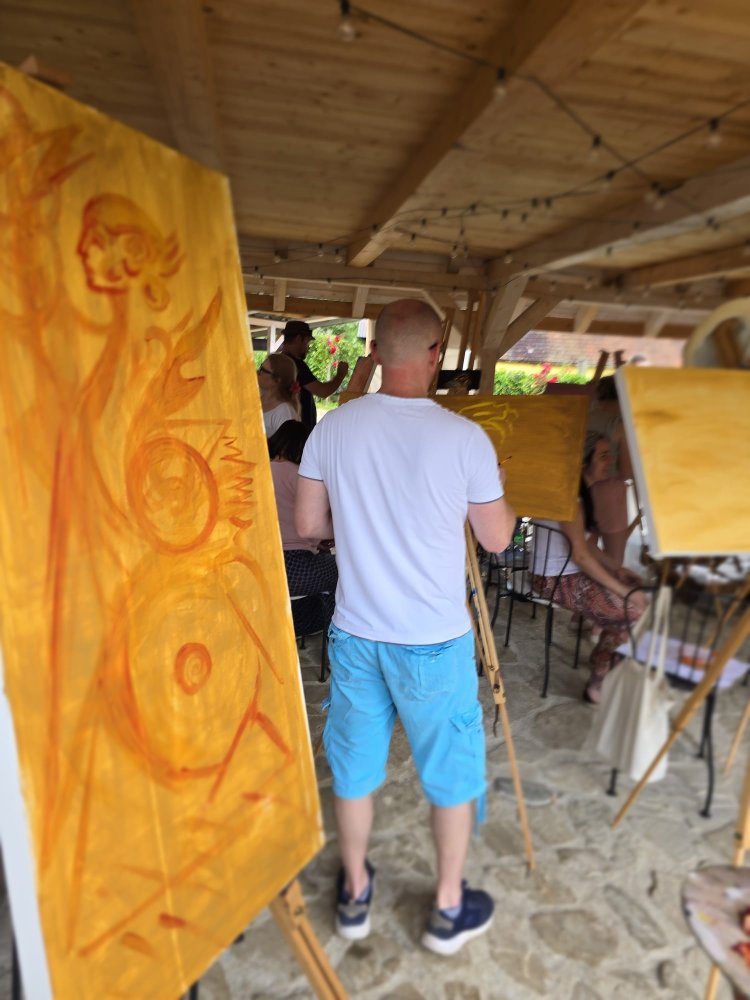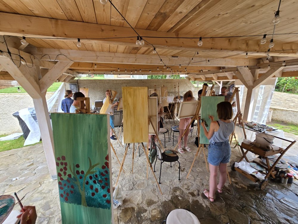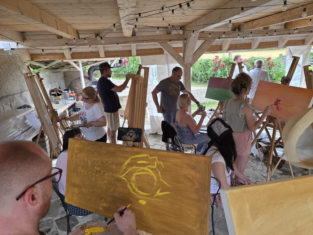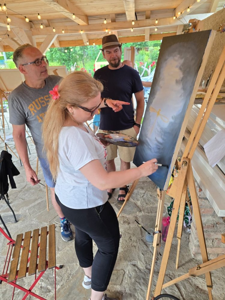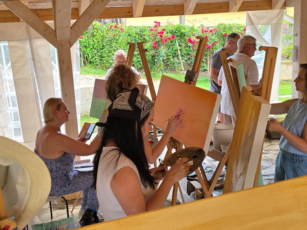 Popoludní sa pozornosť sústredila na technický a filozofický dialóg medzi dvoma výrazovými médiami – olejom a akrylom. Pod vedením renomovaného pedagóga Libora Kalába z UMPRUM Praha maľovali dospelí umelci z celého Slovenska aj Čiech. Čestný hosť kurzu, prof. Svatopluk Adámek, svojím monumentálnym dielom – reinterpretáciou Poslednej večere na stene altánu, v priestore tematizoval sakrálne umenie ako architektúru medzičasia.