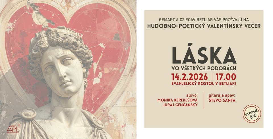 Dovoľujeme si Vás pozvať na valentínsky poeticko-hudobný večer, ktorý ponúkne reflexiu lásky ako existenciálneho fenoménu, presahujúceho romantické klišé a dotýkajúceho sa základných otázok ľudského vzťahovania, blízkosti a zodpovednosti.